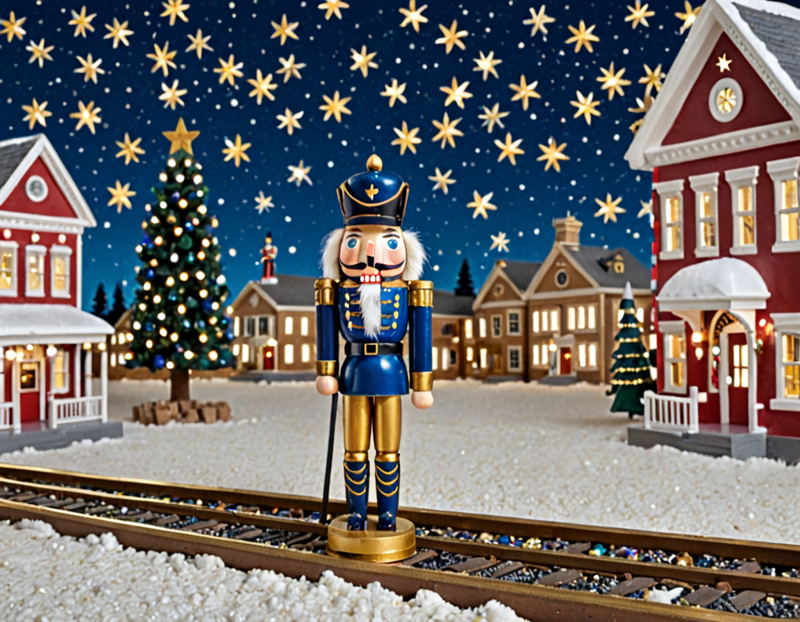 nutcracker, full body shot, blue and gold uniform, masterpiece, ultra realistic, toy shop, <lora:Holiday_Nutcracker:1>, spaceship, stars, night sky, trains, library, train tracks, christmas tree