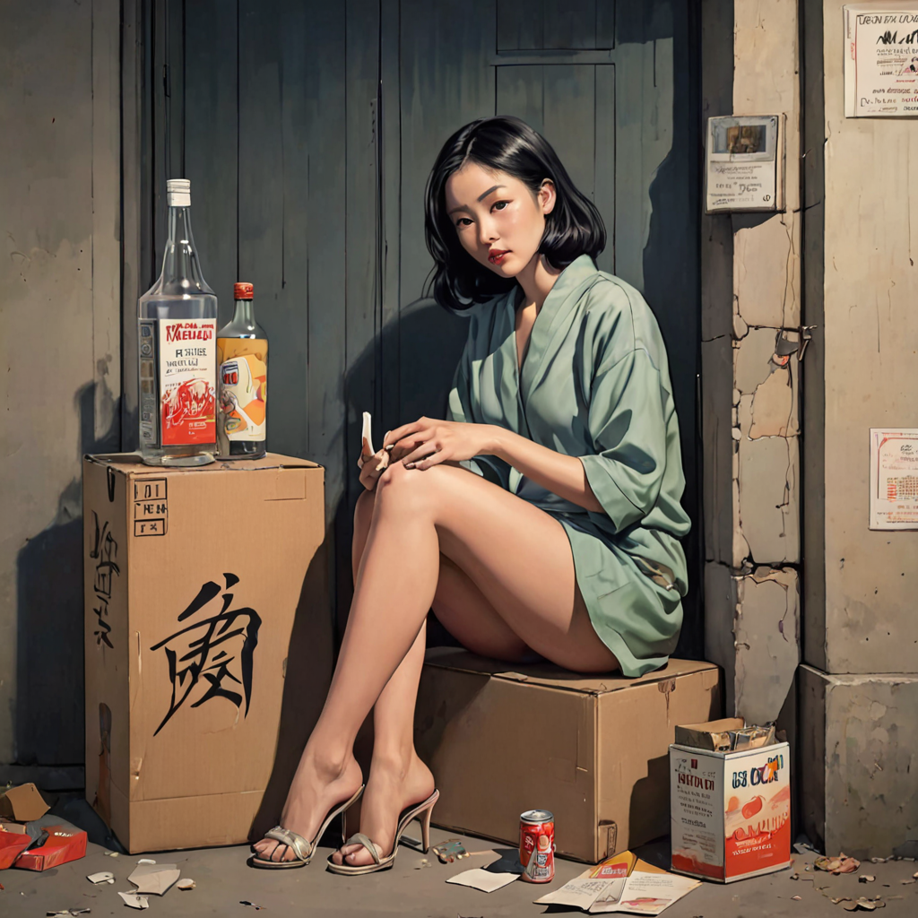 smudged cubist portrait of wasted sleepy Mulan sitting on the cardboard-box at night under the street lamp holding empty booze bottle and cigarettes, barefoot, dirty, wearing one heel, (contemporary), gradient spotlight shadow background, by artist "MAPPA", Manga, ((anamorphic)), (((comic drawing illustration))), (detailed eyes), perfect face, detailed textures, by [Picasso|Gil Elvgren] and retro comic, complementary colors