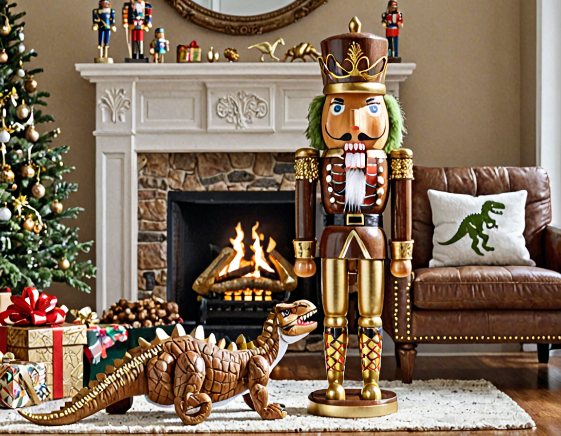 nutcracker, walnuts, presents, full body shot, brown and gold, masterpiece, ultra realistic, <lora:Holiday_Nutcracker:1>, fireplace, indoors, furniture, sofa, living room, dinosaur, toys