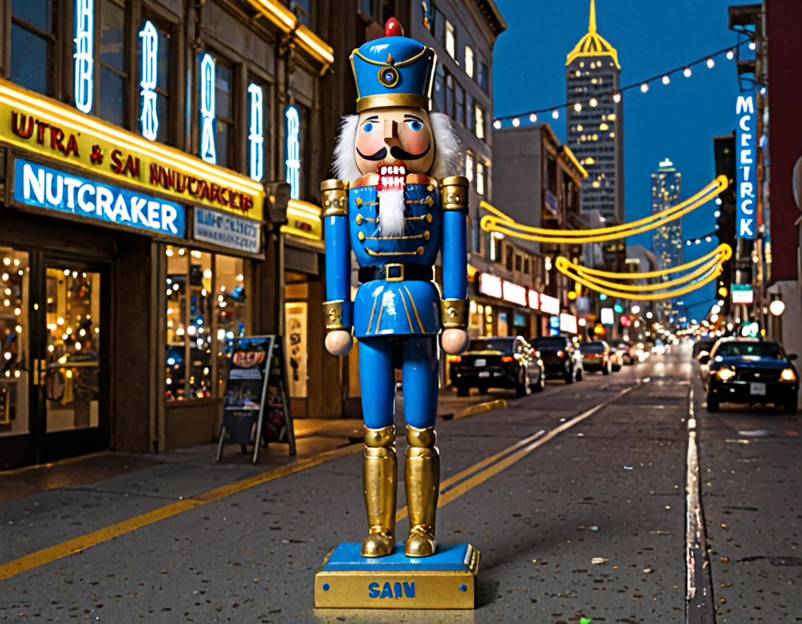 nutcracker, full body shot, blue and gold uniform, masterpiece, ultra realistic, toy shop, <lora:Holiday_Nutcracker:1>, city landscape, cars, cyberpunk, neon lights, city streets, bridges, san francisco
