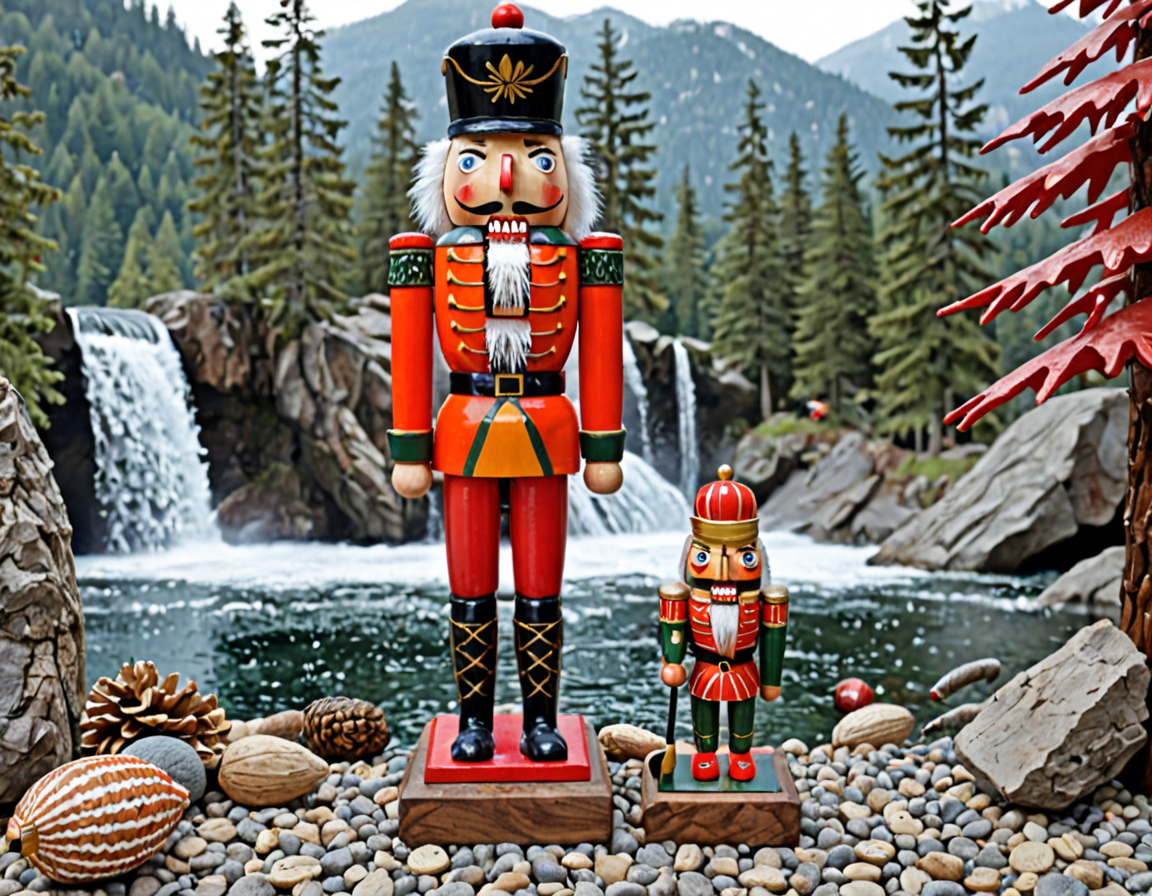 nutcracker, cracking a walnut, full body shot, orange and red uniform, masterpiece, ultra realistic, toy shop, <lora:Holiday_Nutcracker:1>, mountains, forest, waterfall, fish, eagle