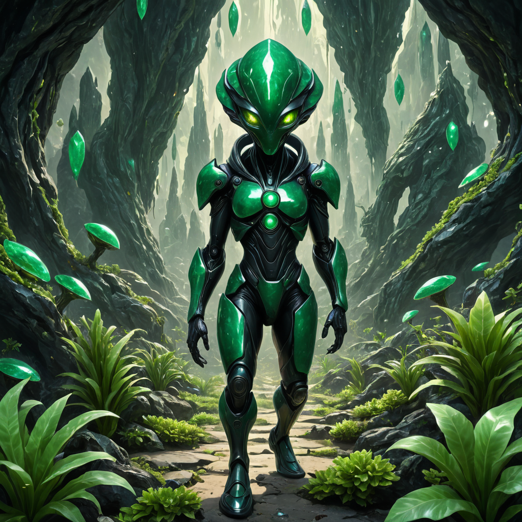 A curious alien explorer made entirely of jade, walking through a glowing alien landscape filled with jade-like crystals and strange green plants. The alien holds a scanner emitting light. Sci-fi, mysterious, and otherworldl