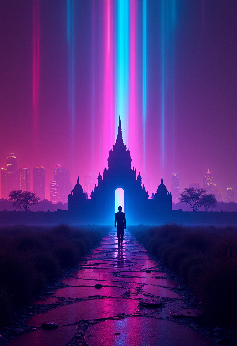 A surreal vision: a colossal Borobudur Temple stands majestically bathed in a vibrant glow of neon pink and electric blue, its arches emitting light beams **** ethereal tentacles. The temple's intricate structure is set against an endless vaporwave desert landscape, where the ground glimmers with glitching, reflective patterns. In the distance, the iconic skyscrapers rise **** beacons, their neon lights casting a futuristic sheen.