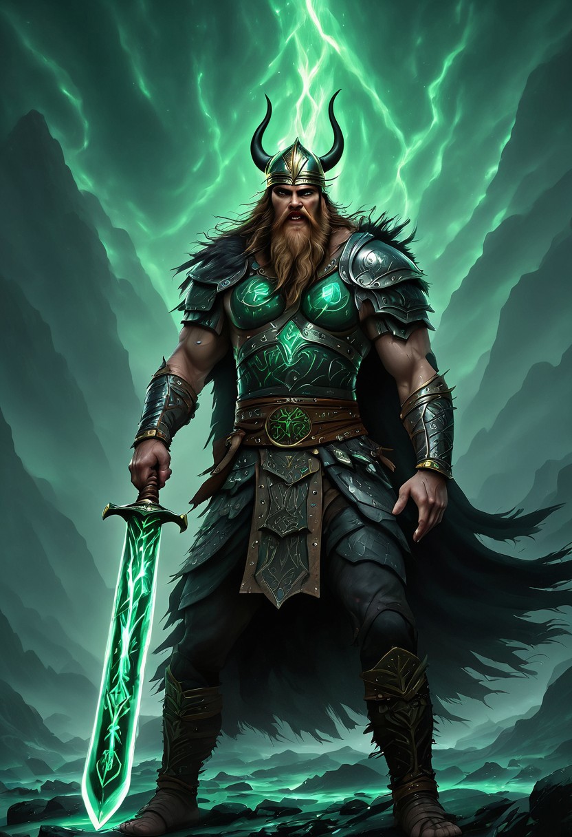 VALHERO obsidian jade viking warrior holding a legendary glowing sword that scares his enemies