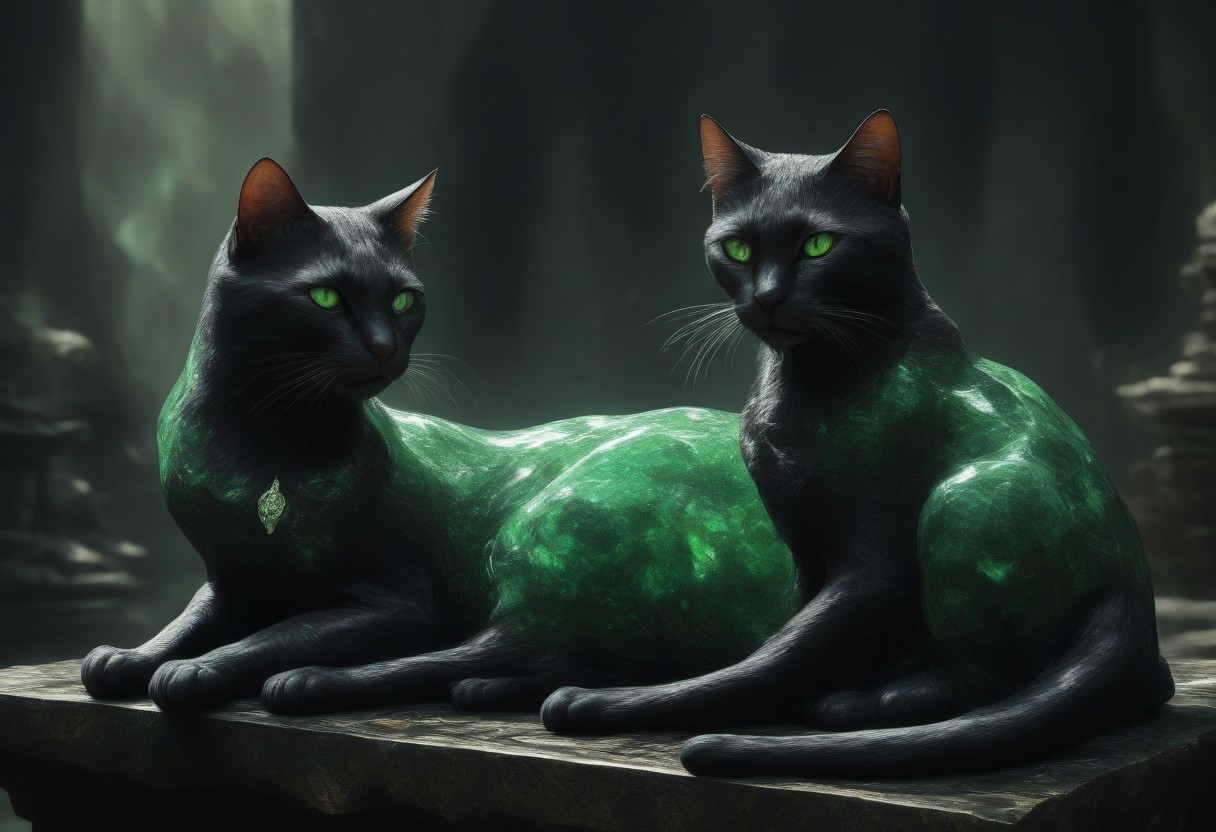 score_9, score_8_up, score_7_up, A mystical, jade and obsidian-themed scene with two sleek ginger cats on a weathered, dark stone roof. The cats are enhanced with elegant, otherworldly modifications: one has glowing jade-green eyes and obsidian claws, resting calmly as if absorbing energy under the soft glow of ambient green light. The other cat, with intricate, jade-like patterns and black obsidian streaks running through its fur, moves carefully across the cracked, dark tiles, its movements reflecting the subtle shimmer of polished stone. The environment is serene yet haunting, with smooth, polished obsidian surfaces contrasting with the rough, cracked jade tiles. In the background, glowing green mist and ethereal patterns drift in the air, creating a mystical atmosphere. Soft, radiant jade light casts shadows that emphasize the sleek, cybernetically enhanced features of the cats, while a distant, low hum echoes through the air like an ancient force at work.