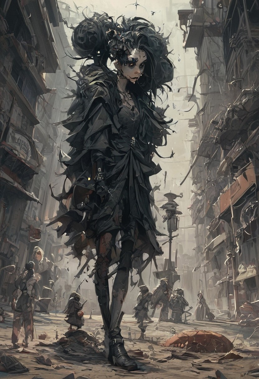 score_9, score_8_up, score_7_up, score_6_up, profile left, Dark Beauty, background with buildings, A scary girl, full body, a lone person getting surrounded by an angry mob of people in a circle, surreal illustration, stunning details, alabaster skin, long crazy black hair, dark eyes, a dark and mysterious appearance, facial tattoos, gothic aura. Sci-fi Environments,