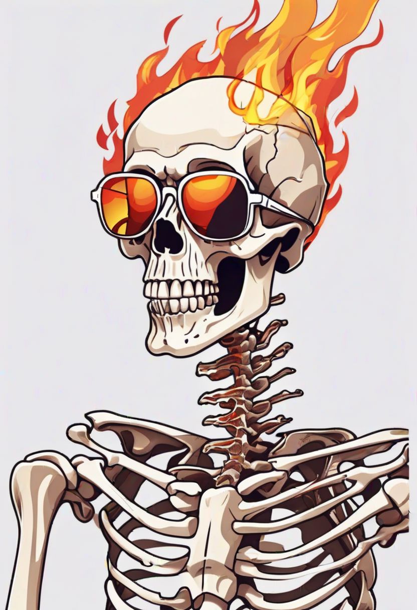 illustration skeleton wearing trendy sunglasses with fire Bones Botany, side view, sticker, clean white background, professional vector, high detail, graffiti, vibrant