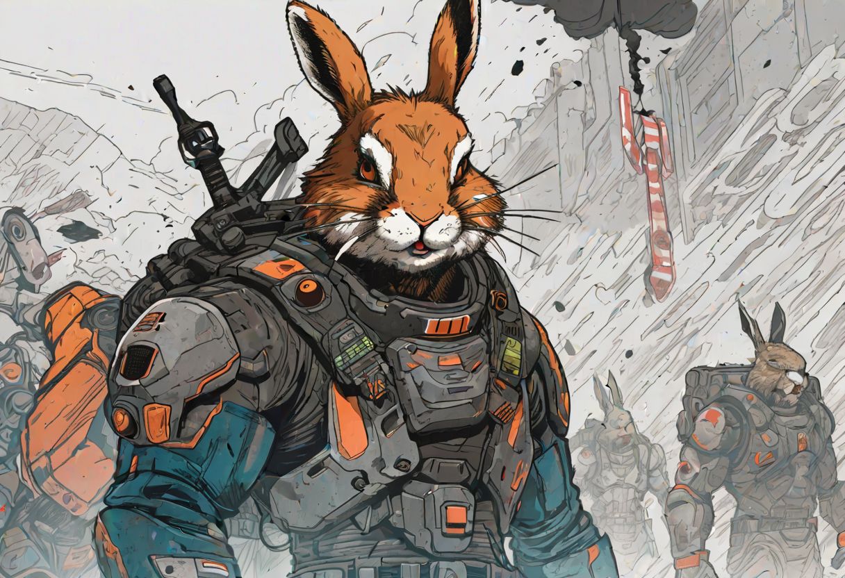 A buff strong easter bunny with a scar on his left eye chewing a carrot