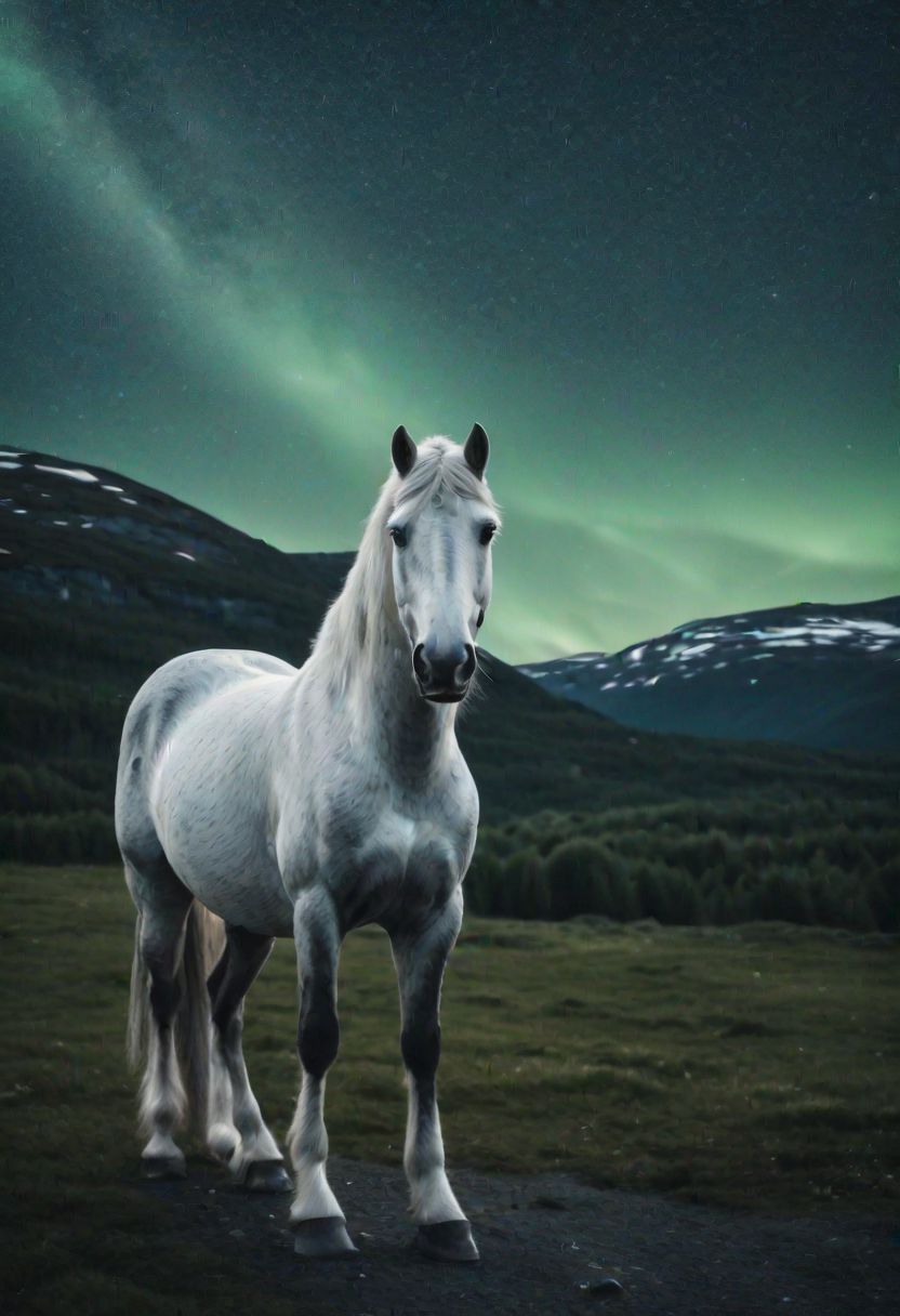 Create a photo of Nordic Horse with a starry night sky in Norway, with a faint green glow beginning to illuminate the sky. (realistic)