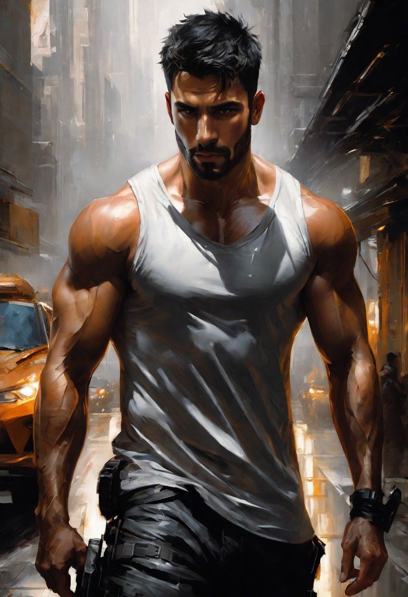 oil painting by raymond swanland, scifi, futuristic, rugged chiseled muscular kuwaiti man, body hair, early 30s, very-short hair, dark wavy hair, dark skin, short beard, smirking, skintight sleeveless v-neck t-shirt, soft facial features, in the city, confident, smirking, extreme detail, ornate detail, exquisite detail, fine detail, a masterpiece, perfect composition