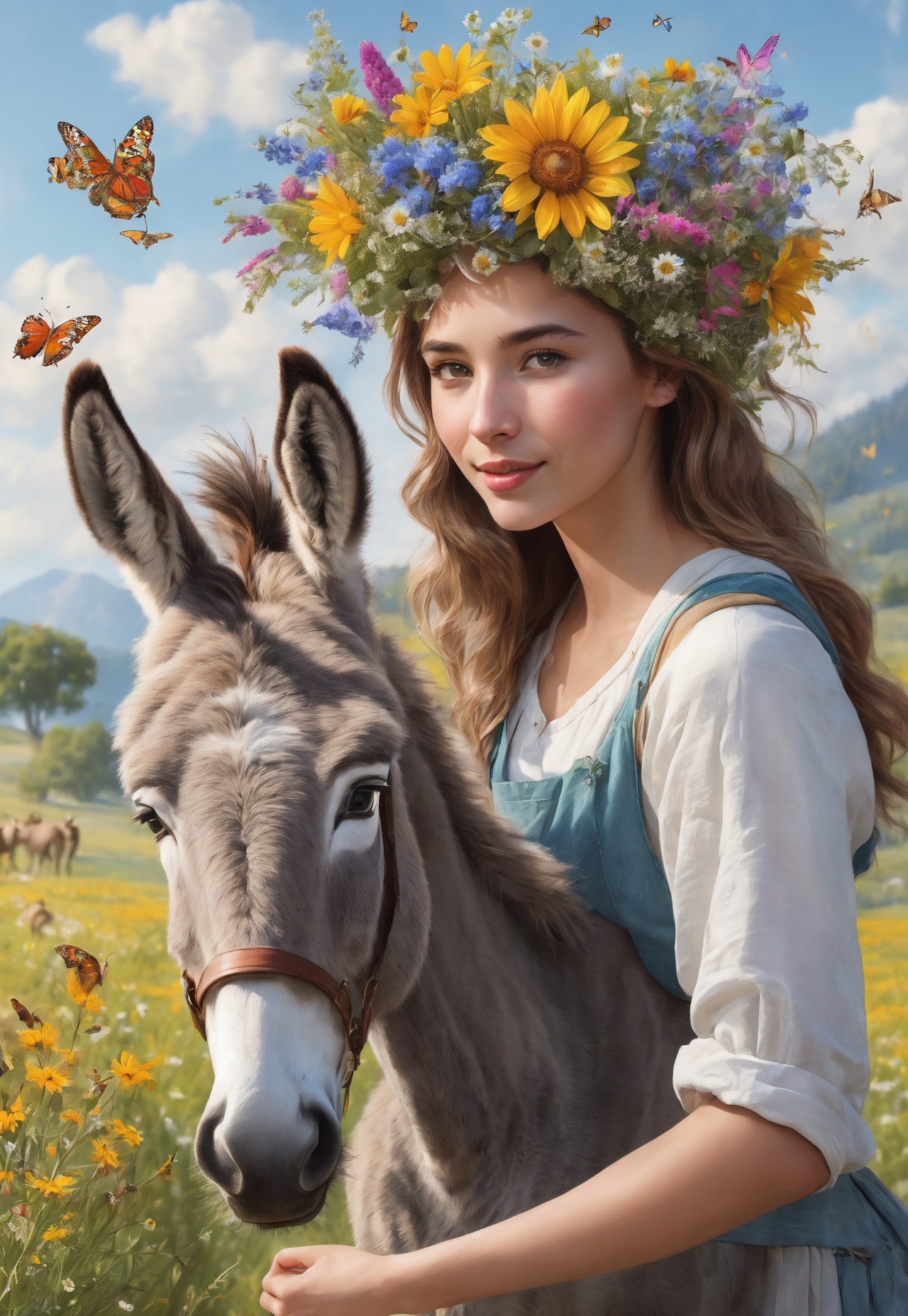 (highres lowres:1.1) (a young woman collects a bouquet of wildflowers in a field, a wreath of flowers is on her head, a donkey is grazing next to the woman in the field, butterflies are flying in the air)
