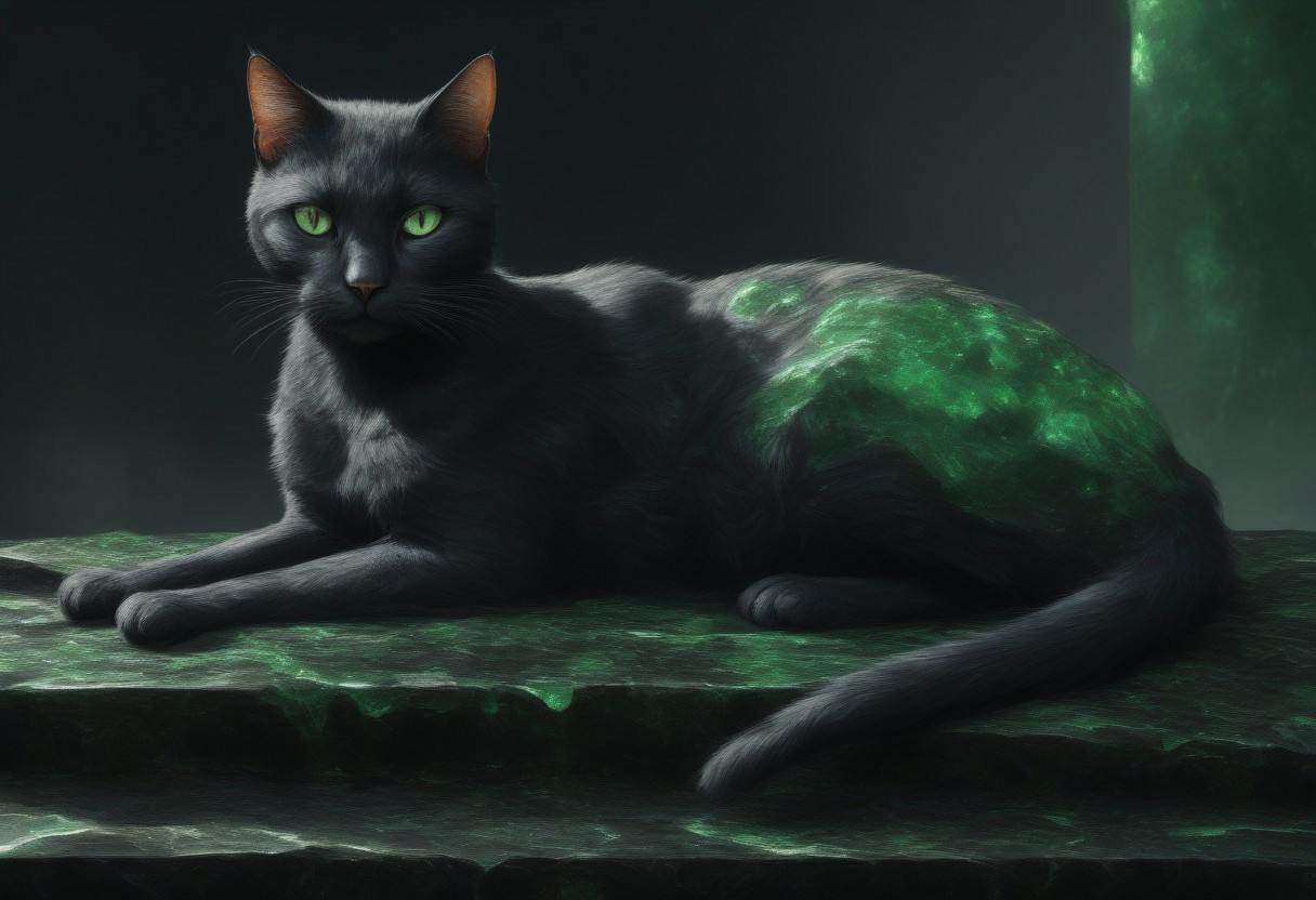 score_9, score_8_up, score_7_up, A mystical, jade and obsidian-themed scene with two sleek ginger cats on a weathered, dark stone roof. The cats are enhanced with elegant, otherworldly modifications: one has glowing jade-green eyes and obsidian claws, resting calmly as if absorbing energy under the soft glow of ambient green light. The other cat, with intricate, jade-like patterns and black obsidian streaks running through its fur, moves carefully across the cracked, dark tiles, its movements reflecting the subtle shimmer of polished stone. The environment is serene yet haunting, with smooth, polished obsidian surfaces contrasting with the rough, cracked jade tiles. In the background, glowing green mist and ethereal patterns drift in the air, creating a mystical atmosphere. Soft, radiant jade light casts shadows that emphasize the sleek, cybernetically enhanced features of the cats, while a distant, low hum echoes through the air like an ancient force at work.