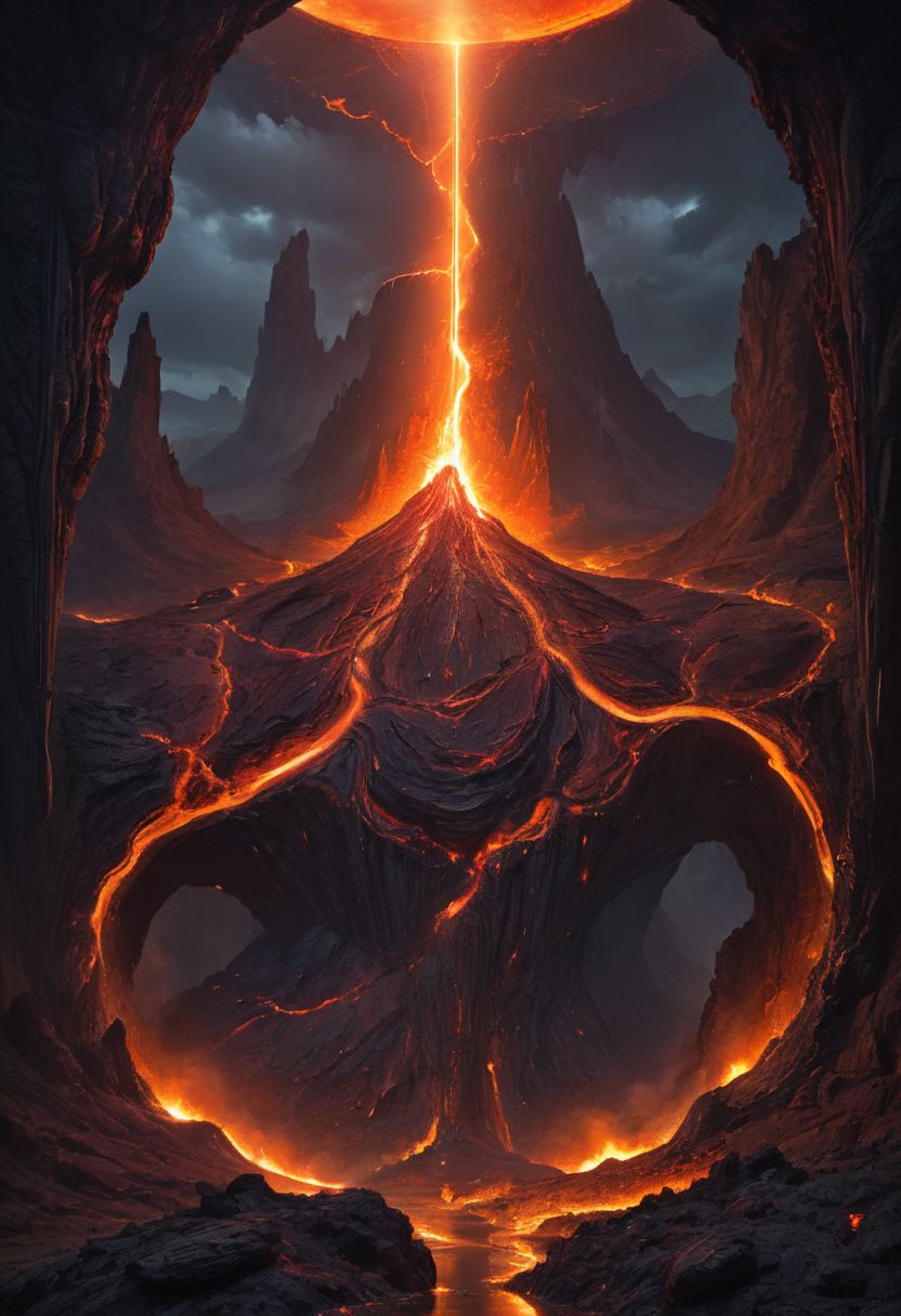(score_9)(score_8_up)(score_7_up)(score_6_up), (masterpiece:1.2), best quality, (hyperdetailed, highest detailed:1.2), high resolution textures, cinematic scene, long distance ((horizon)), source: alien_planet, bioluminescent, glowing, dark, chiaroscuro, low-key, dark puffy clouds, many sharp stalagmites in backround horizon, BREAK mystical landscape, multiple levels of landscape, circular, (long twisting landscape), fractals, symmetry landscape, ((at the far horizon a detailed Volcano)), ((large valley in the foreground)), ((winding lava river in the center of valley)) clifftops, cliffs, crevices, (((rows of sharp stalagmites on either side of the lava river)), ((many thick lava streams flowing around many rocks and stalagmites)), (multiple lava streams meandering around rocks and stalagmites), ((lava reflections off the surface of rocks)), bioluminescent glows, BREAK night, dark sky ((large, perfect symmetry tornado sitting ontop of large Volcano)), BREAK epic, complex, by Todd Lockwood, by Alessio Albi, by Mikalojus Ciurlionis, (professional, intricate details, masterpiece, best quality:1.5), ((sharp focus)), high contrast, highest details.