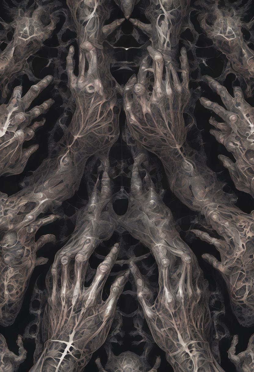 fractal body horror, many human bodies repeated and endlessly dividing into self-similar arms and legs and eyes and faces, indistinct anatomical features, infinite body parts repeated into the distance, faces and hands recursively, horror novel cover art, dark and moody aesthetic, extremely detailed