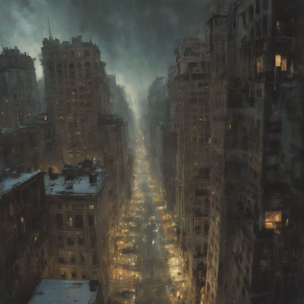 art by Jeremy Mann, dark clouds in the sky, view from below, woman with flowing skirts flying between buildings, levitating, clothes like midnight full of stars, Night light, sharp shadows, moon lit, looking out over city, European city landscape, old winding roads, dystopian city, crowds of people, standing high above street,