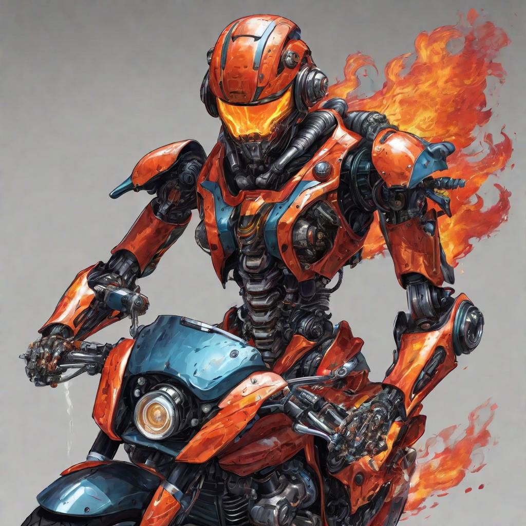 a robotic humanoid with aspects of a motorcycle such as handlebars on his shoulders, exhaust pipes on his forearms and legs, two tire wheels instead of feet, a head resembling a motorcycle helmet and a fiery paint job color scheme.