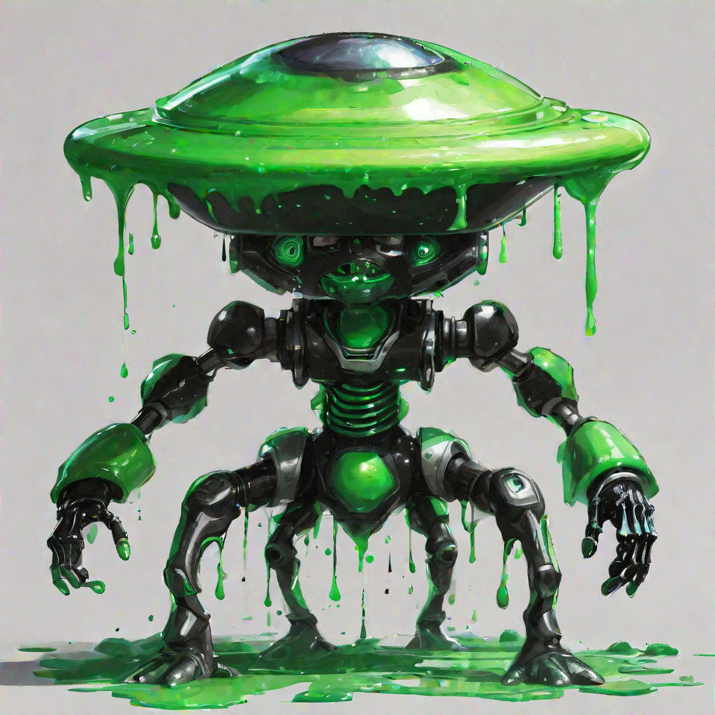 a mass of green goo. He can change shape at will via his UFO on top of his head, His most common form is a humanoid shape, but he can alter it in a variety of ways due to his lack of a skeletal structure. His gravity projector is silver, black, and green. Usually, it floats above him to stabilize his form.