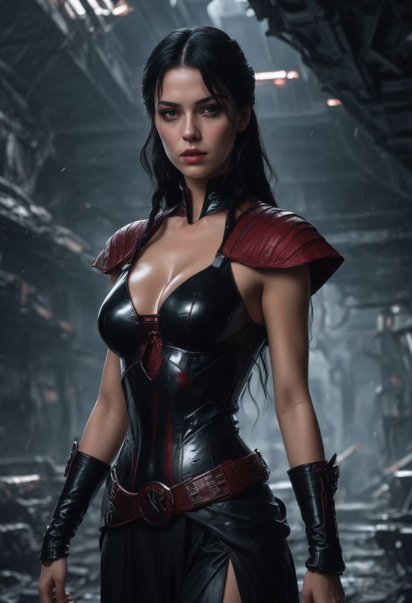 Beautiful sinister Dark Sith girl, Intricately Designed dark sith black-red Dress, Star Wars style, Standing aboard an Imperial Destroyer, realistic eyes, wavy black hair, Sensual female curves, perfect athletic figure, beautiful perfect detailed pupils, wet oily shiny skin, beautiful firm Breasts, defiant and seductive, high contrast, colorful polychromatic, ultra detailed, ultra quality, CGSociety fighting stance, Cinematic Lighting, intricate, smooth, sharp focus digital painting, Asymmetrical Balance, hyperdetailed painting, dynamic lighting, complex, head and full body portrait, 8k resolution concept art portrait by Greg Rutkowski, Attractive, Atrractive 21 years old woman, Attractive bust girl
