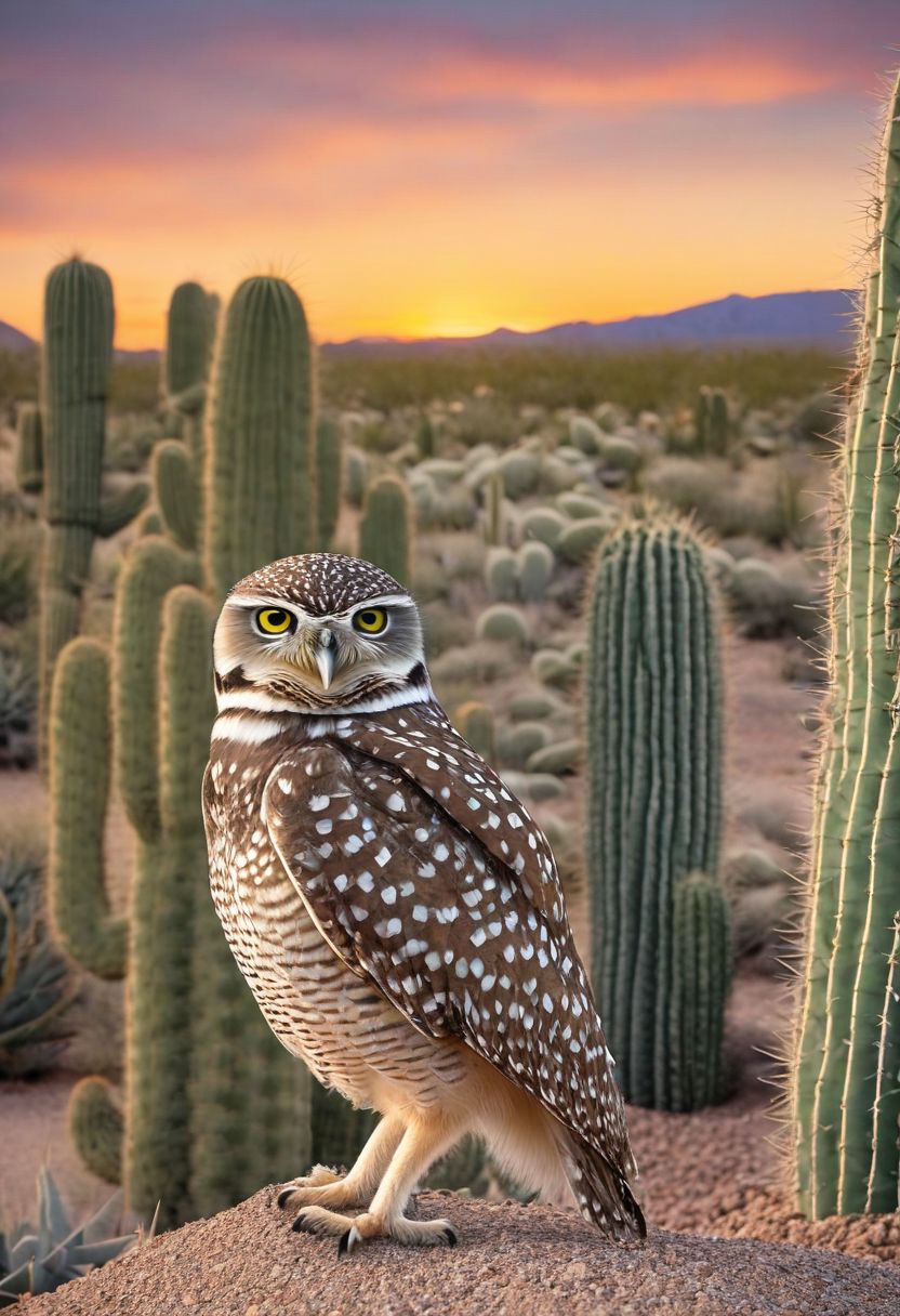 As the sun begins to set, an Burrowing Owl owl sits in a cactus with only its head out of the cactus. Very realistic photography