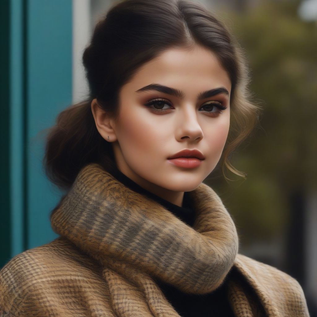 Skeuomorphic portrait of a Selena Gomez (ohwx woman) <lora:SelenaGomez-000007:1>. She wearing a long fur scarf that is wrapped around her neck at least three times, with fur ear muffs, and fur cuffs around her wrists. Underneath all the fur she is wearing a houndstooth patterened mohair turtleneck jumper. Her makeup is colorful & vibrant makeup, with her hair long and flowing, and with a fringe that comes down to her eyes. High definition, high quality, super high quality, best quality, perfect face, perfect hair, perfect clothing