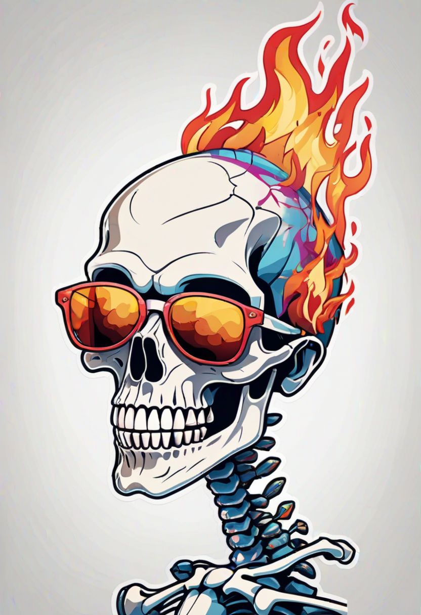 illustration skeleton wearing trendy sunglasses with fire Bones Botany, side view, sticker, clean white background, professional vector, high detail, graffiti, vibrant