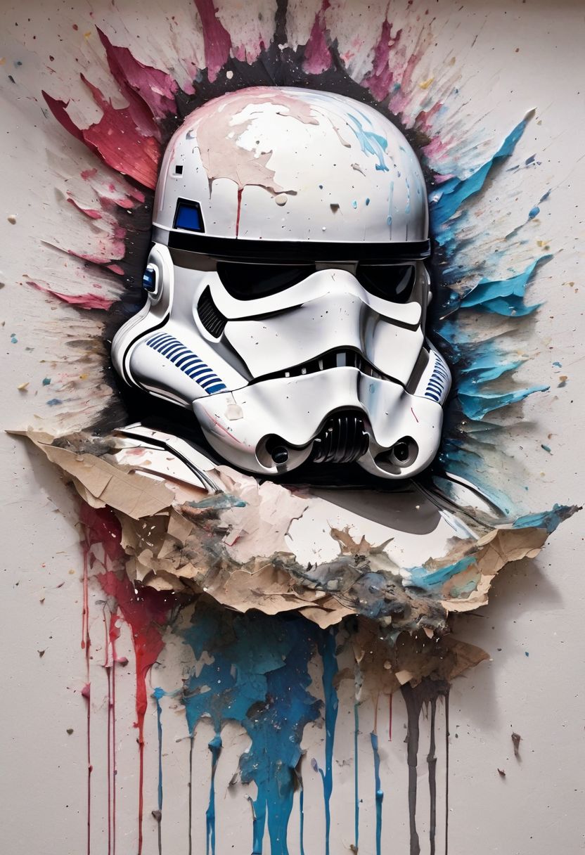 "3D art!!!!! heavy impasto paper sculpture of 1stormtrooper in Yin Yang, torn dirty paper in the rain, unfinished, Swirling pastel background of 3D Yin Yang symbol, bursting through the paper, torn paper edges, water splashing, 3D effect, watercolor, by Carne Griffiths, Minjae Lee, Ana Paula Hoppe, Waterhouse, masterpiece