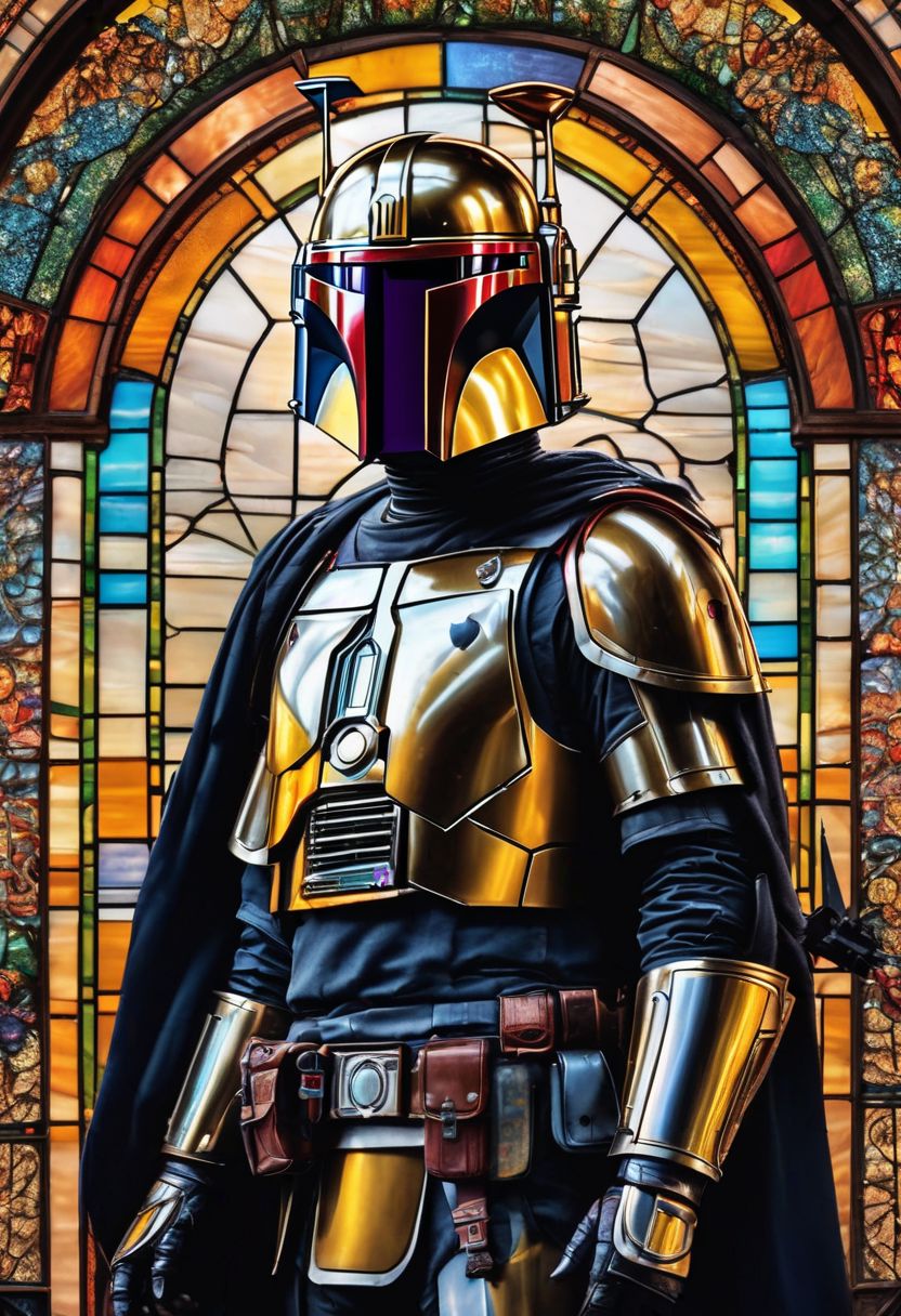"Sparkling stained glass!!!! Boba Fett made of ornate colorful stained glass, beautiful snow white, '('('( sparks glitter, dramatic light, sparkles, highly detailed professional photography by Alphonse Mucha, Syd Mead, Erik Johansson, Pino Daeni, tilt shift, masterpiece, incredible depth, dramatic lighting, cryengine, complementary colors, vibrant triadic colors. Fantastic detail. Depth of field. Incredible color contrast." Weight:1.3 "Sparkles and fairy dust float and pop around his helmet and armor." Weight:1.3 "intricate details, HDR, beautifully shot, hyperrealistic, sharp focus, 64 megapixels, 16k resolution, shot on DSLR, perfect composition, molecular precision, high contrast, cinematic, atmospheric, moody, photorealistic, hyper detailed, tilt shift, cinematic color film still. UHD. Weight:1.2 Fantastic detail. Depth of field. Incredible color contrast." Weight:1.3 "intricate details, HDR, beautifully shot, hyperrealistic, sharp focus, 64 megapixels, 16k resolution, shot on DSLR, perfect composition, molecular precision, high contrast, cinematic, atmospheric, moody, photorealistic, hyper detailed, tilt shift, cinematic color film still. UHD. Weight:1.2 "ugly, tiling, poorly drawn hands, poorly drawn feet, poorly drawn face, out of frame, extra limbs, disfigured, deformed, body out of frame, blurry, bad anatomy, blurred, watermark, grainy, signature, cut off, draft" Weight:-0.3