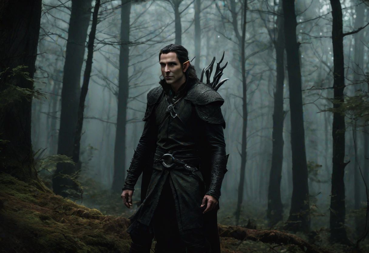 ((a rogue elf, dark arts of shadow magic, forest), Alaric, (mysterious, dramatic lighting), sinister, haunting, (eerie atmosphere, (deep shadows)), long exposure, telephoto lens, (fantasy, elven), masterpiece, best quality, (mystical), trending on ArtStation, (dark fantasy))