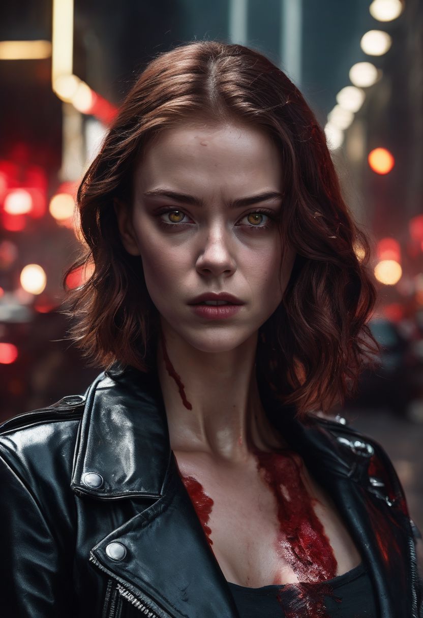 Ultra-realistic digital painting of an Terrifying Sadie Sink as Terminator woman, T-800, ultra realistic 8K, HDR, Cyborg, Leather black Jacket, sci-fy, Realistic Cyborg Red Eye, wavy red hair, broken bloody face, Sinister Terminator woman, Half of a cyborg skeleton face, cyborg sinister by Greg Rutkowski, standing defiantly amidst a dark street, sinister ruined street city, blood-stained and smeared with dirty, red as complementary colours, fire, Photograph Taken on Nikon D750, Intricate, Elegant, Digital Illustration, Scenic, full body, HyperRealistic, HyperDetailed, Unreal Engine, CryEngine, Octane Render, ctive, defiant and seductive, covered in dirty and blood, cinematic colors Lighting, extremely detailed, 8K, Attractive
