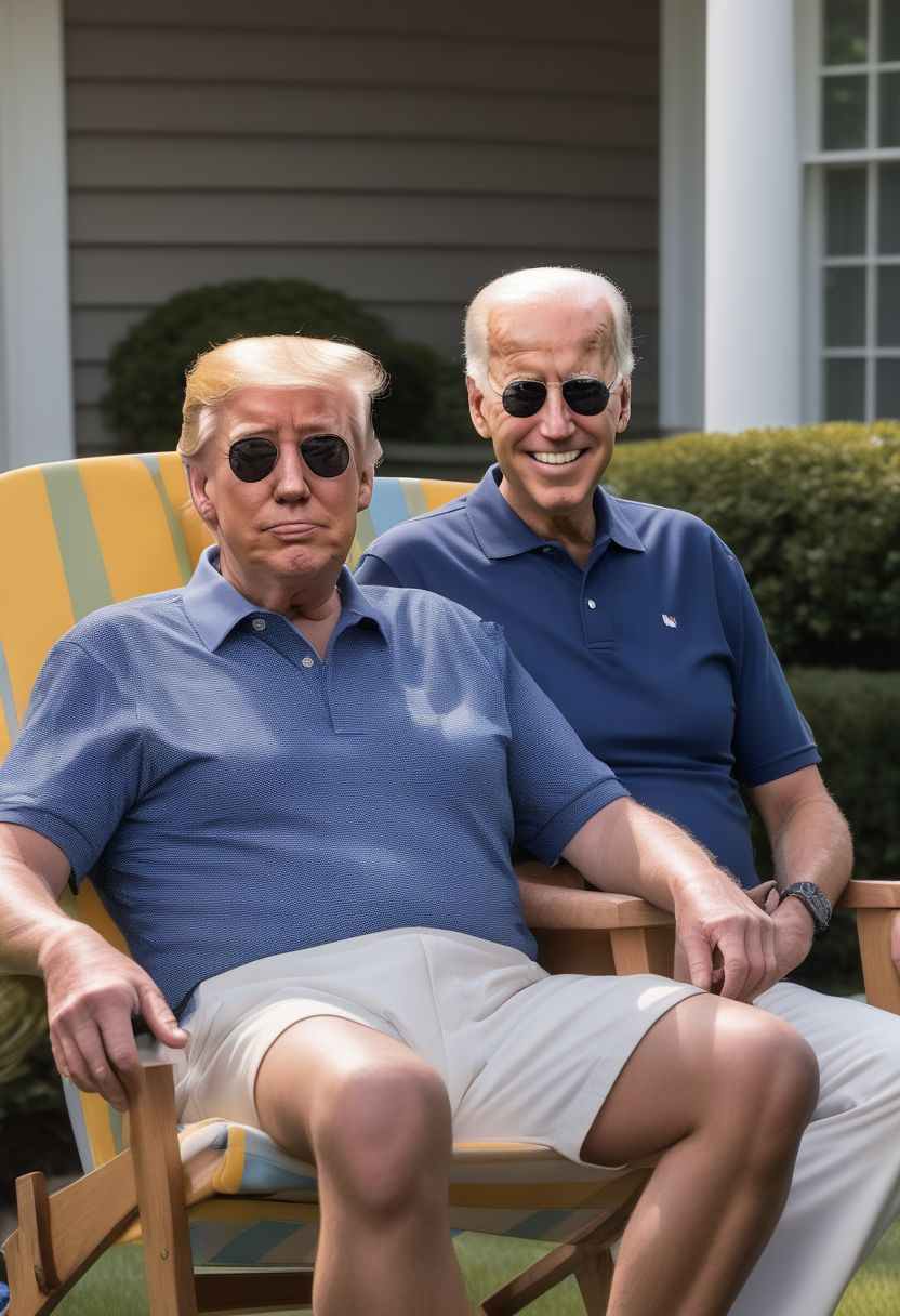 portrait, closeup, trump and biden resting on deckchairs, Joe biden sits on the left, joe is wearing shorts and flowery shirt, sunny day, front yard, BREAK, donald trump sits on the right, donald trump is wearing a polo shirt,