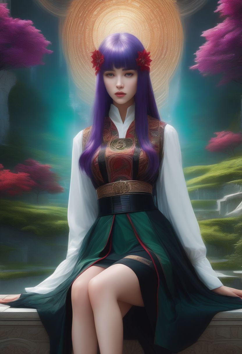 1 girl, beautiful face, seductive expression, long purple hair, flowing, bangs, blue pupils, red face, slightly open lips, white tight hip skirt (black and green lines on both sides of the skirt), black tunic belt, black stockings (length to upper knee), white booties (wrapped to the ankles), graceful sitting posture, full body, front view, from below, detailed clothing details, dynamic angle, terminal harem, realistic, edge lighting, masterpiece 8k UHD, DSLR, high quality, high resolution, 8k, bokeh, absurd, gorgeous background, sci-fi background, futuristic background, background detail detailed, masterpiece, high quality, (masterpiece, top quality, best quality, official art, beauty and aesthetics: 1.2), (1girl: 1.3), very detailed, (fractal art: 1.1), (color: 1.1) (flowers: 1.3), most detailed, (zentangle: 1.2), (dynamic pose), (abstract background:1.3), (shiny skin)