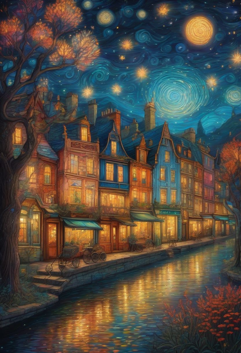 A mesmerizing masterpiece of fine art, painted in the style of Van Gogh, depicts a whimsical Parisian scene under a starry sky. The ultra-highly detailed illustration boasts vibrant colors and intricate, cinematic elements reminiscent of Dan Mumford and Andy Kehoe's works. The 2D, flat, and adorable characters interact in a mystical setting, with patchwork textures and stained glass patterns adding to the fairytale ambiance. The vintage, storybook-like atmosphere is enhanced by the luminism technique, showcasing the beauty of the complex background and tiny details that bring the scene to life., cinematic