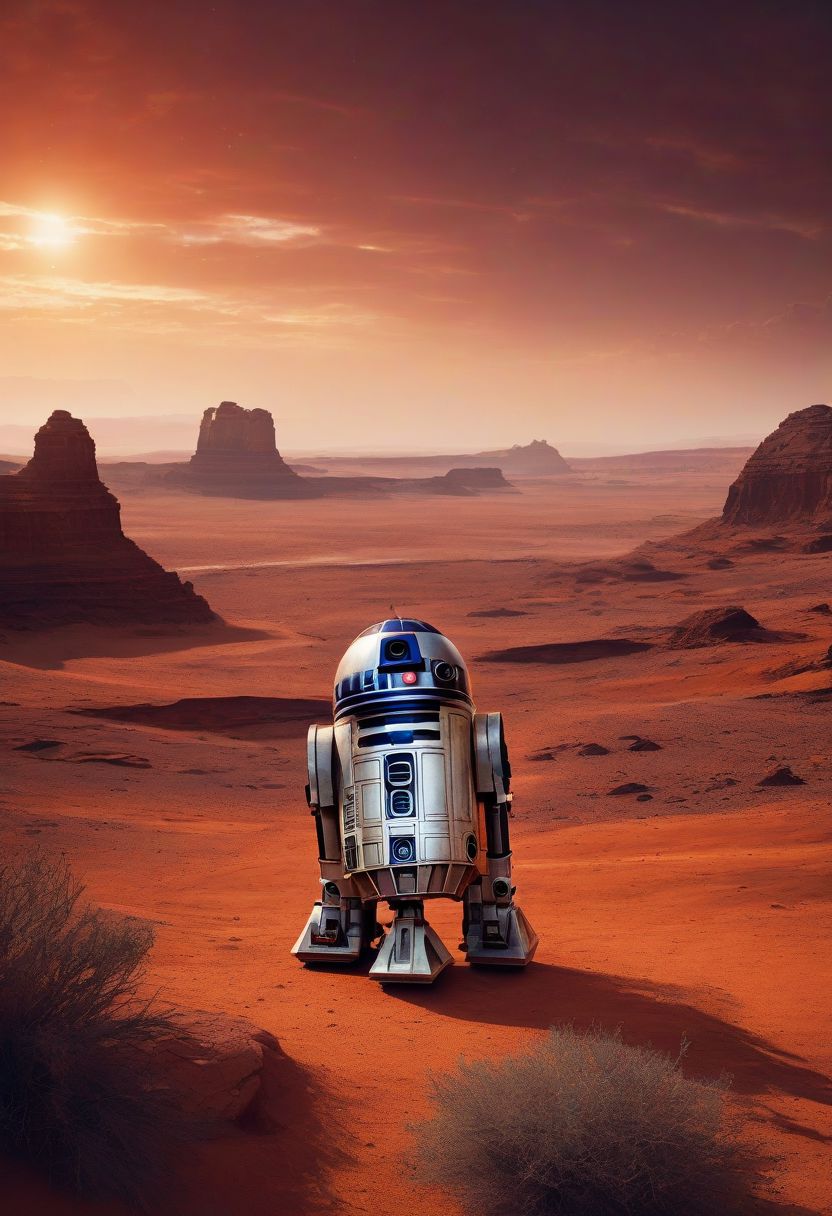 A striking cinematic masterpiece featuring a totally rusted, weathered R2-D2 droid on an alien planet. The iconic droid appears to have been exposed to harsh elements for hundreds of years, with a rusty, reddish-brown hue covering its metallic body. The desert landscape of the unknown planet is filled with strange vegetation and rocky terrain. The sky is a blend of reds and oranges, casting an eerie glow on the scene. The atmosphere conveys a sense of adventure and mystery, as if the viewer has stumbled upon a secret from a long-lost galaxy., cinematic