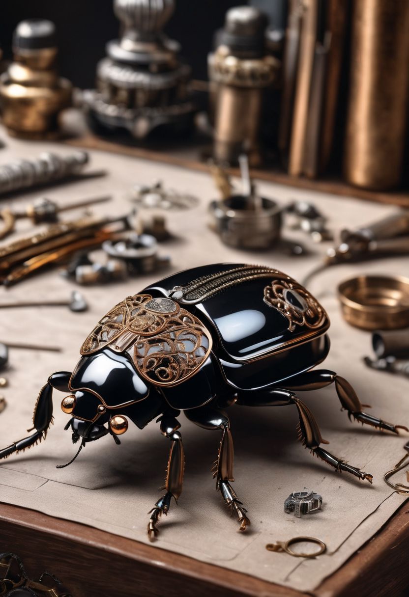 Steampunk Jeweled Glossy Black and Copper Scarab Beetle, on a Roll Top Desk, in a Messy and Disorganized Workshop surrounded by small tools and spare parts, (More Details:2), (photorealistic:2), (intricate and beautiful:3), (highres:1.5),(sharp:1.5), (Maximum Resolution:3)
