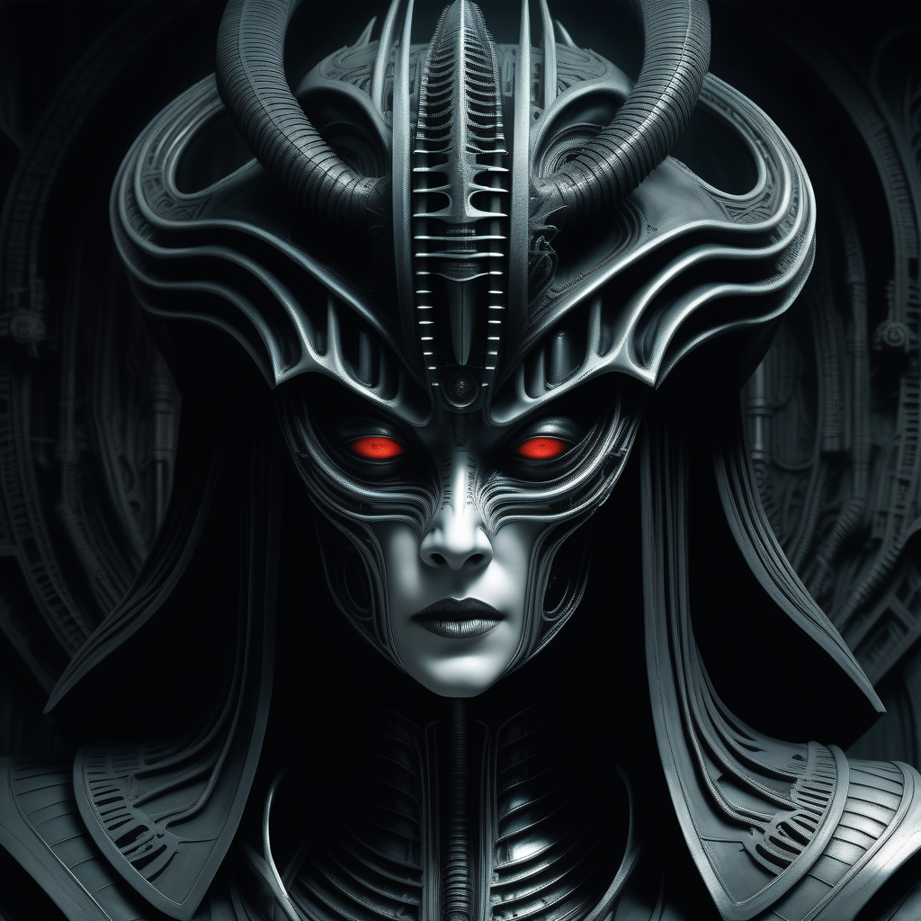 A mysterious lady shrouded in silence and mystery, she wears a human mask of secrecy ( HR GIGER BIOMECHANICAL STYLE), hiding demon face, holding a sword an embodiment of the unknown fire origin,