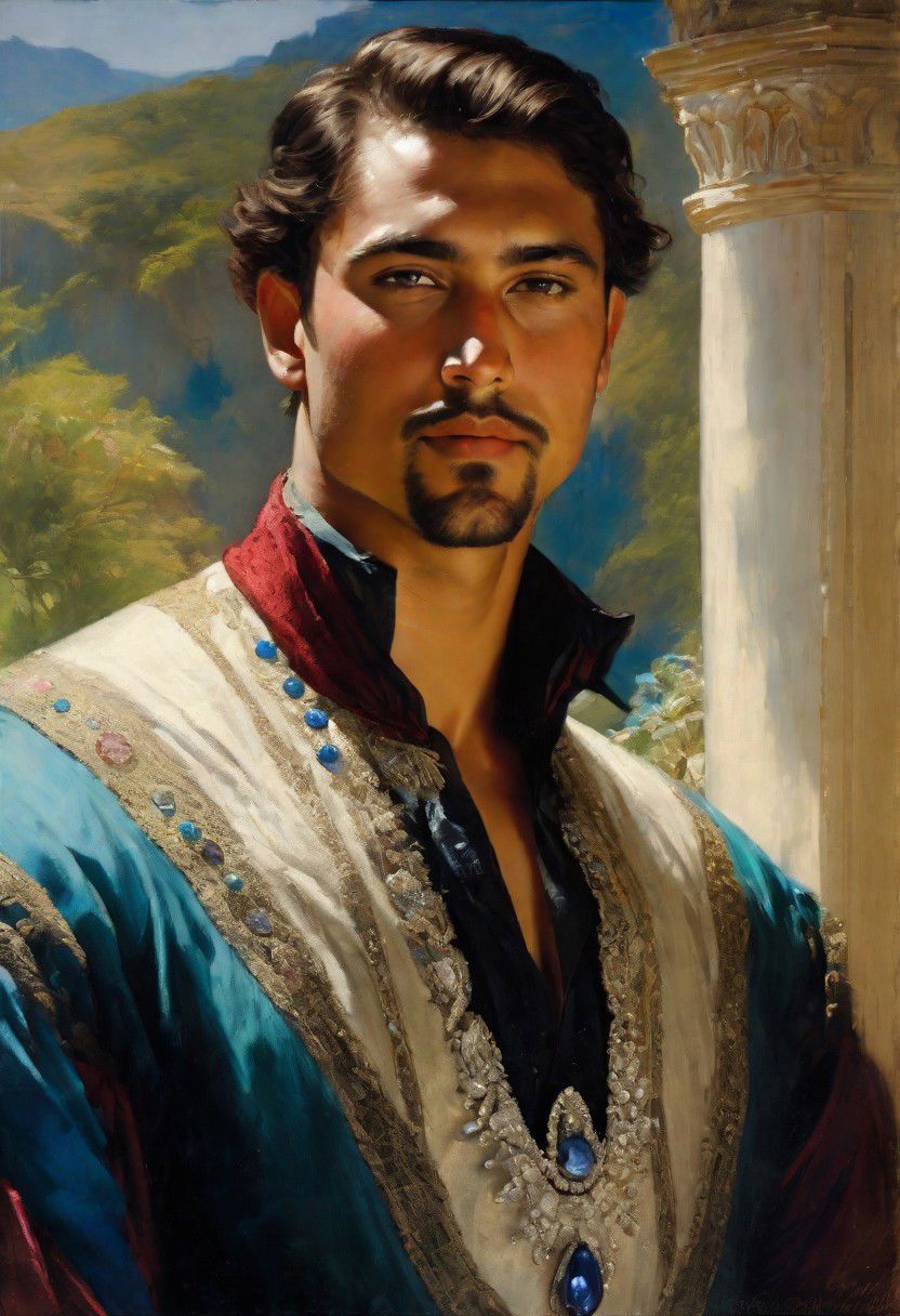 (bust portrait oil painting by gaston bussiere:1.4) of a handsome attractive powerful rugged muscular 38-year-old venezuelan aristocrat looking at viewer, (dark skin:1.5), (short goatee:1.4), sideburns, short auburn hair, finely embroidered sapphire clothes, silver jewelry, barefoot, a balcony in caracas, serene, peaceful, warm colors