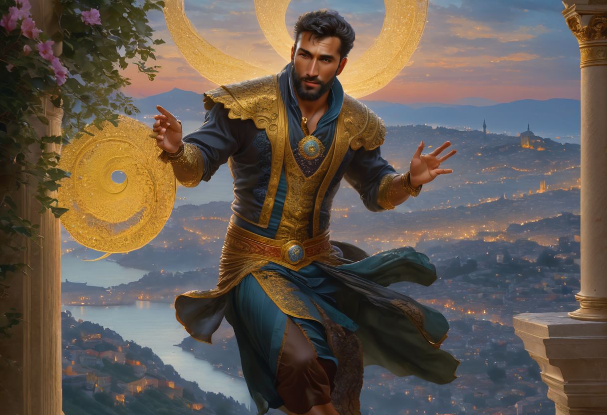 epic fantasy, action shot, oil painting by (guillaume seignac), a hill overlooking istanbul, a handsome rugged turkish mage in his 30s, dark-brown skin, (body hair:1.6), short beard, (short hair:1.4), looking at viewer, casting a spell, (magic lights, effects, swirls, plume, smoke, glitter:1.5), peaceful, serene, nighttime, breeze, intricate ornate extreme fine hyper detail, perfect composition, a masterpiece, trending on artstation, art by mooncryptowow