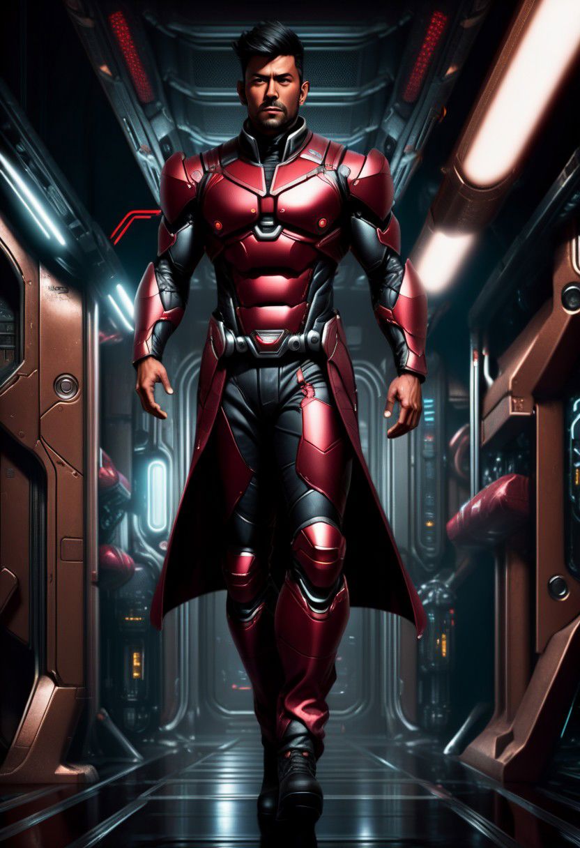 oil on canvas, full body portrait, (((sci-fi, futuristic, high-tech)):1.5), a handsome ((((brawny muscular)))) space pirate, (top hat:1.6), (((sleeveless))) coat, (silver and crimson clothing:1.7), cybernetics, (dark tan skin:2), short beard, short hair, front view, walking through a spaceship, dynamic lighting