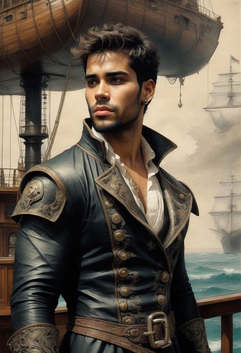 sci-fi, full body portrait, colored graphite on parchment, by jeremy mann, a handsome rugged brawny muscular holy man in his late 20s standing on the deck of a pirate ship, wearing a pirate coat, a parrot, messy (short hair:1.5), dark tan skin, short beard, earrings, plain silver jewelry, round face, soft facial features, seagulls, fine exquisite ornate extreme hyper detail