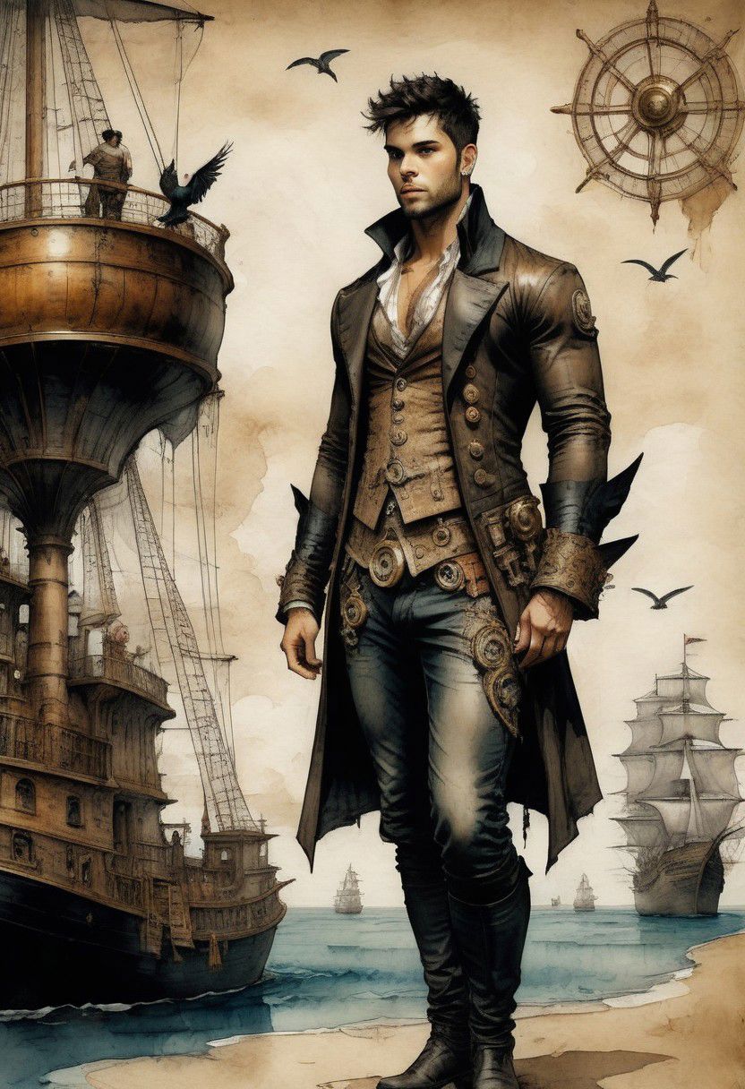 steampunk, full body portrait, ink and watercolor illustration on parchment, by jeremy mann, a handsome rugged brawny muscular holy man, standing on a pirate ship, late 20s, messy (short hair:1.5), dark tan skin, short beard, earrings, plain silver jewelry, round face, soft facial features, seagulls, a parrot, fine exquisite ornate extreme hyper detail