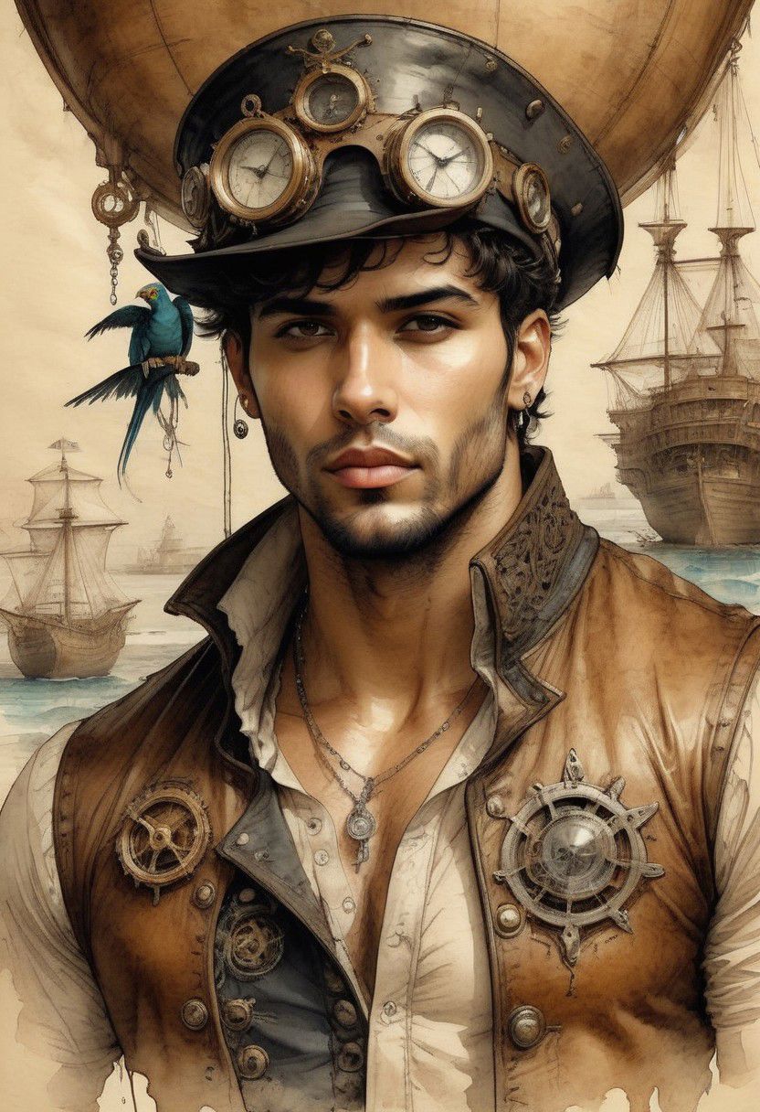steampunk, full body portrait, ink and watercolor illustration on parchment, by jeremy mann, a handsome rugged brawny muscular holy man, standing on a pirate ship, late 20s, messy (short hair:1.5), dark tan skin, short beard, earrings, plain silver jewelry, round face, soft facial features, seagulls, a parrot, fine exquisite ornate extreme hyper detail