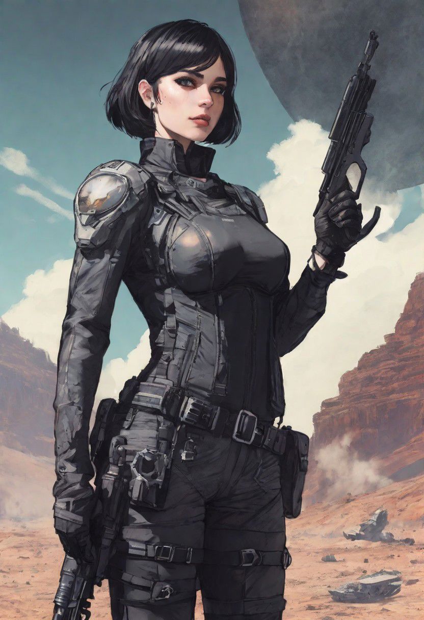Ink, ink drawing, science fiction, Bounty hunter, Dessert clothes, light Armour, colored, Water colors, Pastell colors, Short dark hair, Big gun, gun with scope, rifle, space craft background, smoking