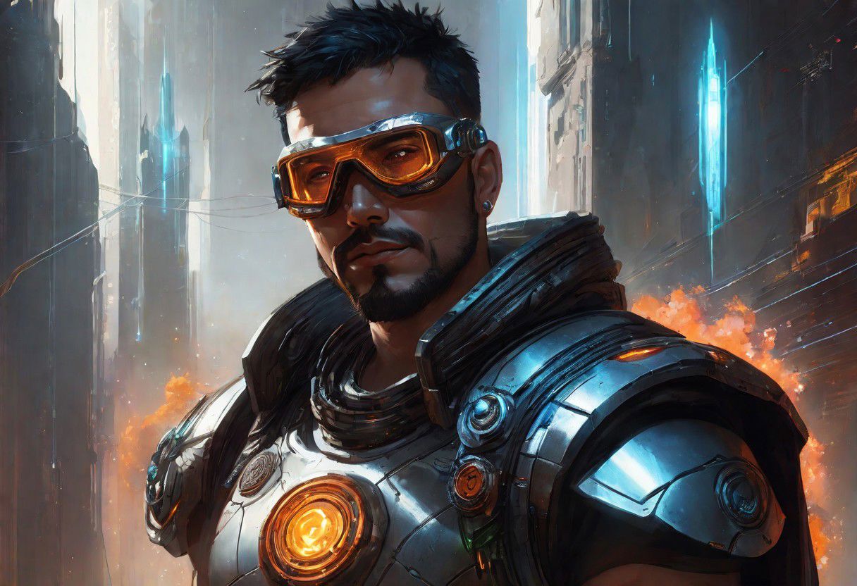 action shot, ((digital painting)) by (sam bosma), (((sci-fi, cyberpunk, high fantasy))), a handsome rugged brawny muscular mexican cyberpriest casting a spell, tinted glasses, early 30s, body hair, (short hair), (dark tan skin), sleeveless robe, white cybernetics, silver trim, short beard, earrings, ((plain) silver jewelry), round face, soft facial features, (iridescent magic (swirls, effects, bloom)), outdoors, (fine, exquisite, ornate, extreme, hyper (detail)), bright color