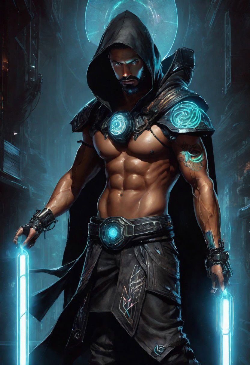 illustration by (stephen hickman), action shot, (((cyberpunk, high fantasy))), a handsome rugged brawny muscular mexican cyberpriest casting a spell, early 30s, body hair, (short hair), (dark tan skin), black sleeveless hooded robe with silver trim, short beard, earrings, ((plain) silver jewelry), round face, soft facial features, (iridescent magic (swirls, effects, bloom)), outdoors, late night, moonlight, (fine, exquisite, ornate, extreme, hyper (detail))