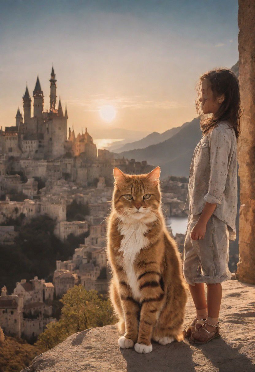a (large human-like cat:1.3) holding a small-sized 20 year old girl in its paws, cat larger a girl, cat with arms larger than woman, cat 3m tall, big cat, tiny girl, castle background, photorealistic, masterpiece, (golden hour:1.2), (warm glow:1.2), warm colors, (30mm f/1.2 portrait:1.2), RAW Photograph, leica full frame camera, high quality, insane details, masterpiece, 8k