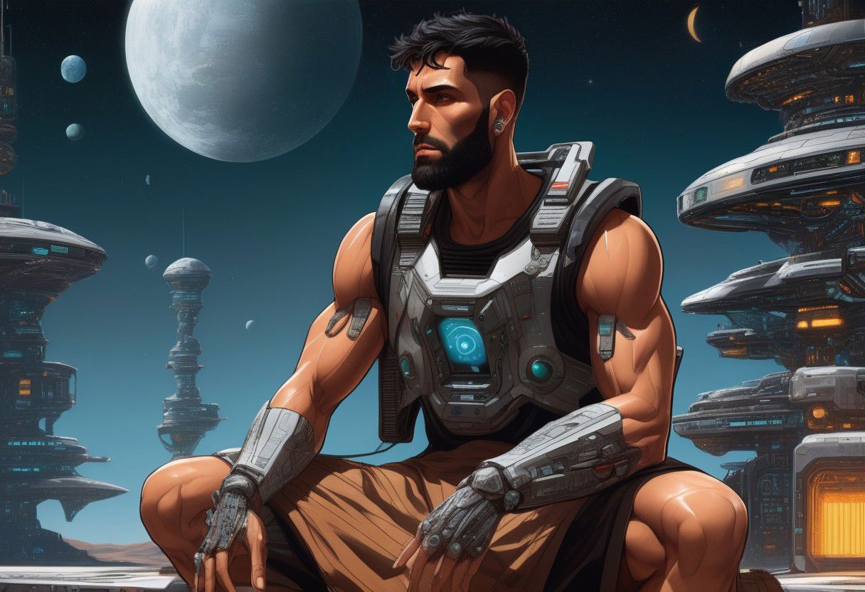 full body wide shot, side view, maximalist, (((sci-fi, high tech, epic fantasy))), ((smooth oil illustration)) of a handsome rugged muscular iranian cyberpriest, ((body hair)), early 30s, (spiky black short hair), (dark tan skin), short beard, earrings, ((plain) silver jewelry), soft facial features, calm, contemplative, solace, outdoors, writing in a notebook, space colony, late night, moonlight, fine detail, exquisite detail, extreme detail, ornate detail, hyperdetailed, intricate detail
