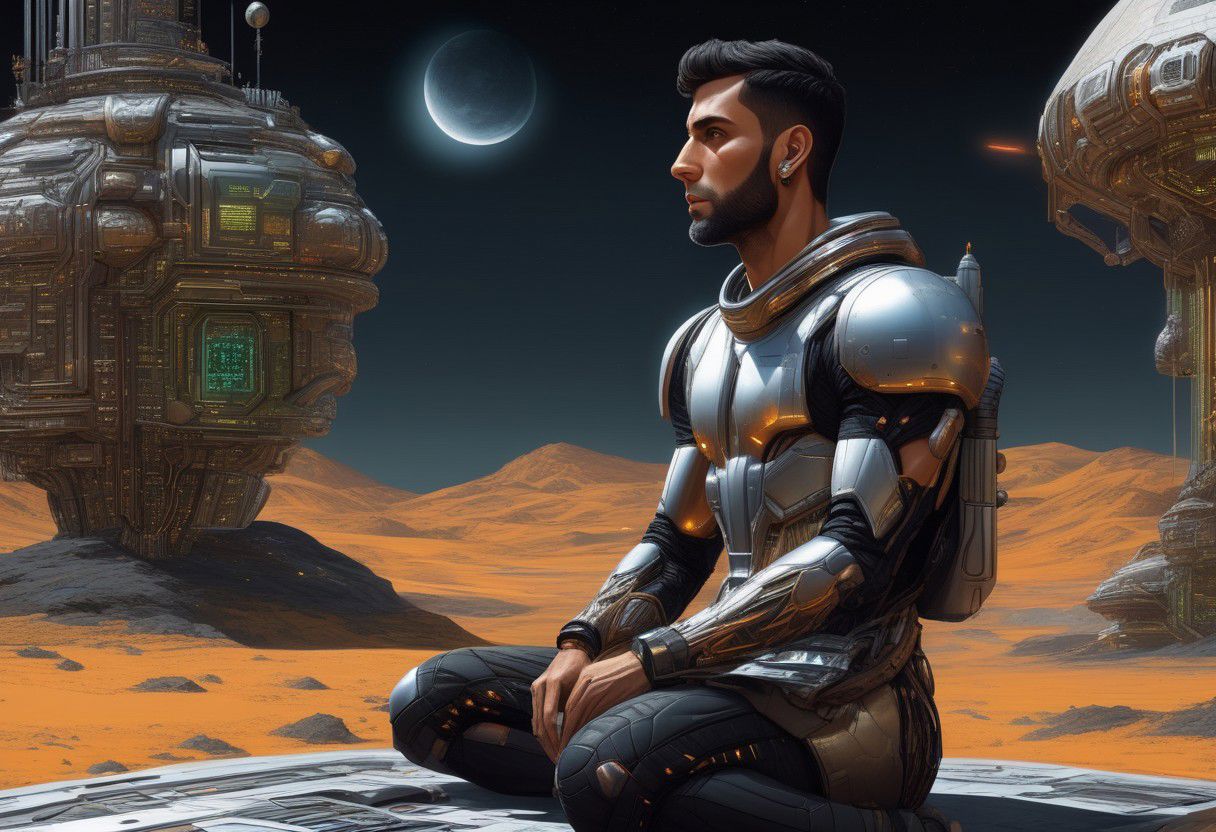 full body wide shot, side view, maximalist, (((sci-fi, high tech, epic fantasy))), ((smooth oil illustration)) of a handsome rugged muscular iranian cyberpriest, ((body hair)), early 30s, (spiky black short hair), (dark tan skin), short beard, earrings, ((plain) silver jewelry), soft facial features, calm, contemplative, solace, outdoors, writing in a notebook, space colony, late night, moonlight, fine detail, exquisite detail, extreme detail, ornate detail, hyperdetailed, intricate detail