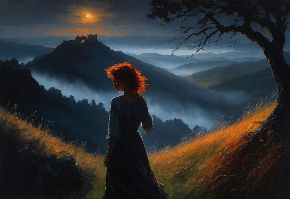 1girl in ethereal landscape, Wide shot of Rinze Morino under decaying tree on hill. Very Dark Night. Very Dim dark-orange Light from side. Long Grass. Dim Silver Moonlight. Dark valley in background. Thick Fog in valley. Standing Close to Gate. Dancing energetically. Celebrating. Arm raised. Laughing. Very Short messy Dark-Red hair with side-parting and undercut. Very Tanned Skin. Shoulders. Small breasts. Oil Painting. (appropriate shadowing), (appropriate direction of light), Very Dark background.