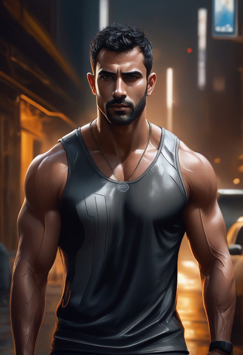 oil painting by darek zabrocki, scifi, futuristic, rugged chiseled lean muscular kuwaiti man, body hair, early 30s, very-short hair, dark wavy hair, dark skin, short beard, grey eyes, smirking, skintight sleeveless v-neck t-shirt, soft facial features, in the city, wax drip, magic bloom, confident, smirking, extreme detail, ornate detail, exquisite detail, fine detail, a masterpiece, perfect composition