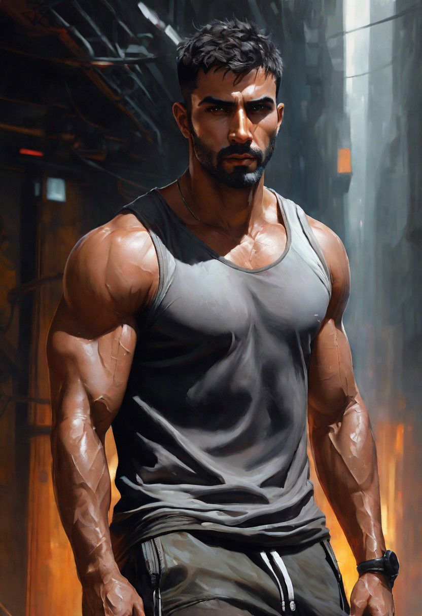 oil painting by darek zabrocki, scifi, futuristic, rugged chiseled lean muscular kuwaiti man, body hair, early 30s, very-short hair, dark wavy hair, dark skin, short beard, grey eyes, smirking, skintight sleeveless v-neck t-shirt, soft facial features, in the city, wax drip, magic bloom, confident, smirking, extreme detail, ornate detail, exquisite detail, fine detail, a masterpiece, perfect composition